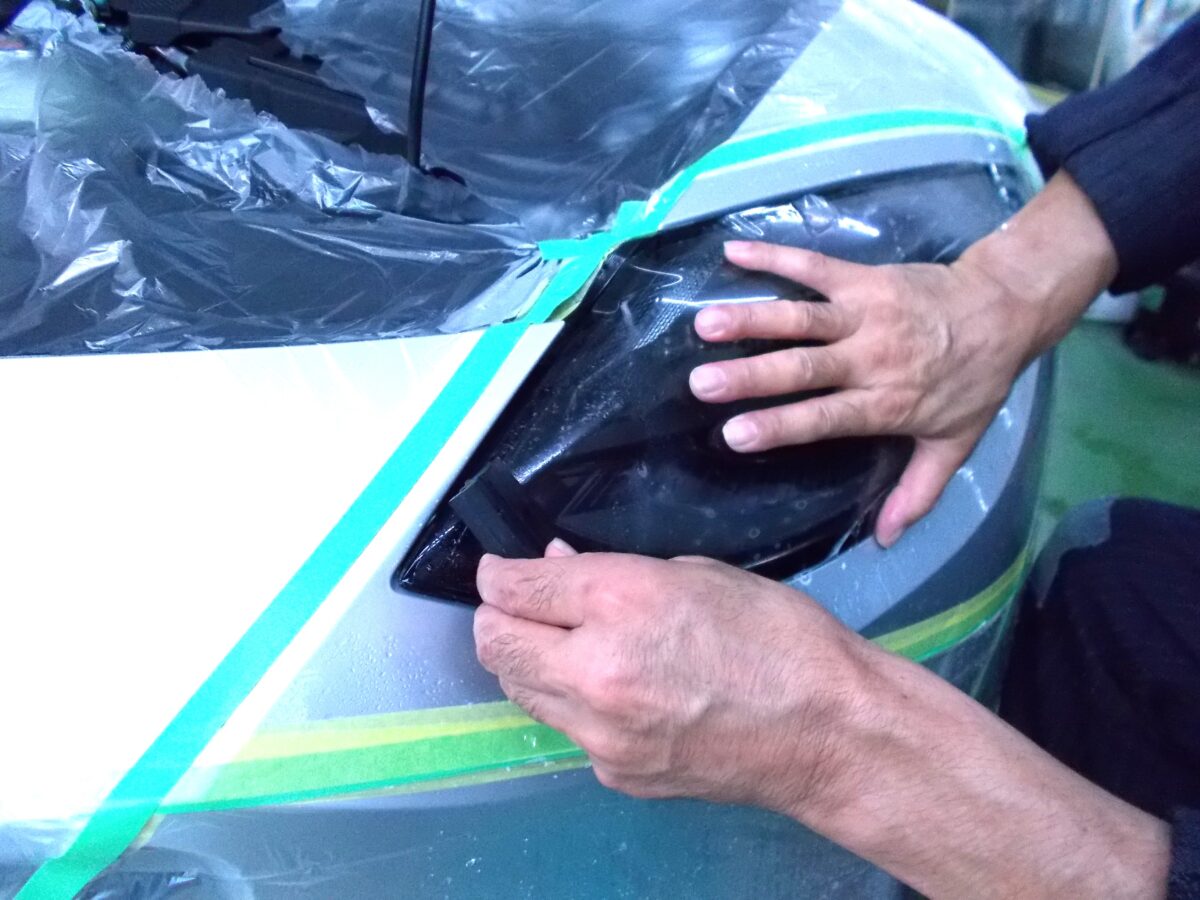 ヘッドライトプロテクションフィルム施工中の写真です。