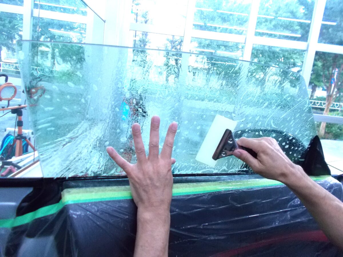 ウインコス透明高断熱フィルムIR-85施工中の写真です。