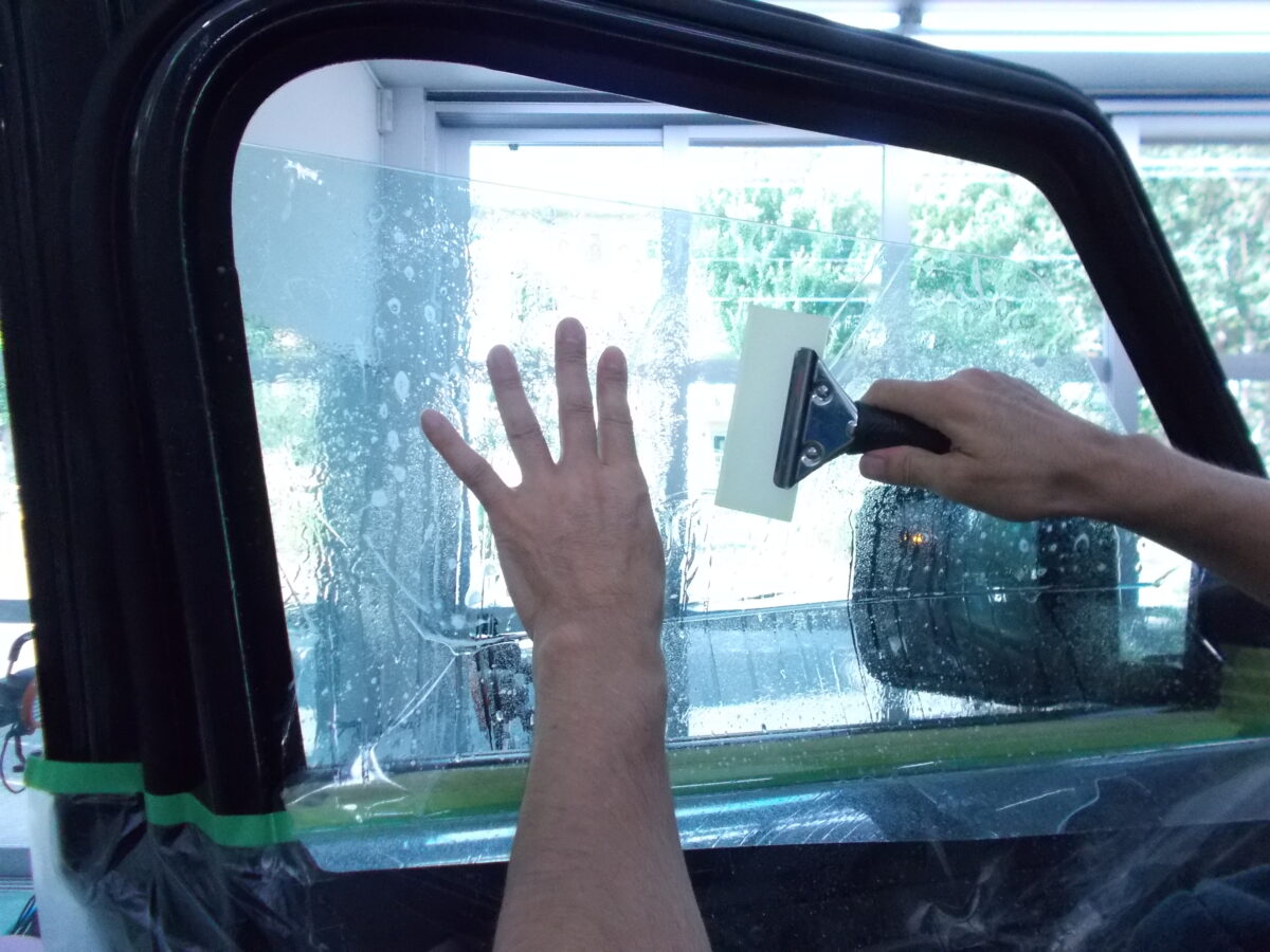 ウインコス透明高断熱フィルムIR-85施工中の写真です。