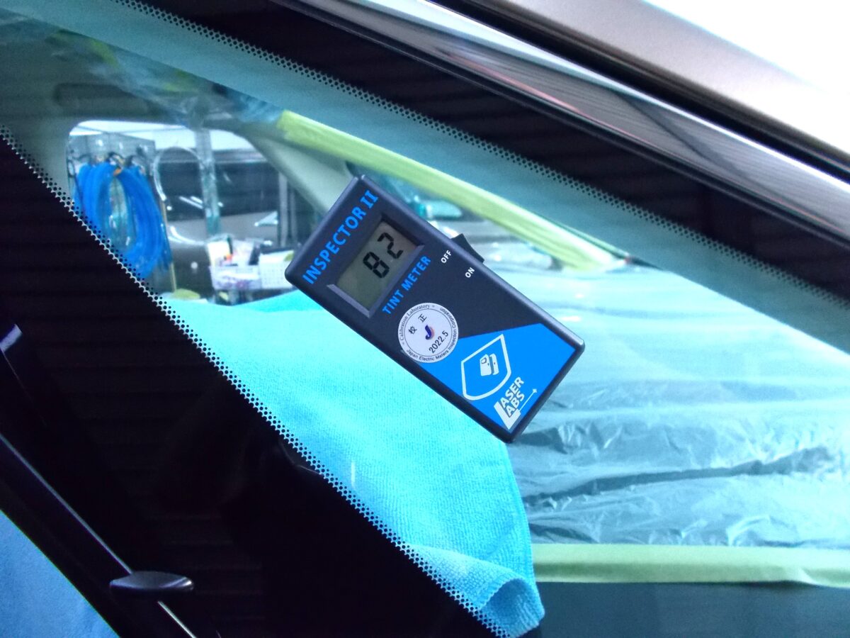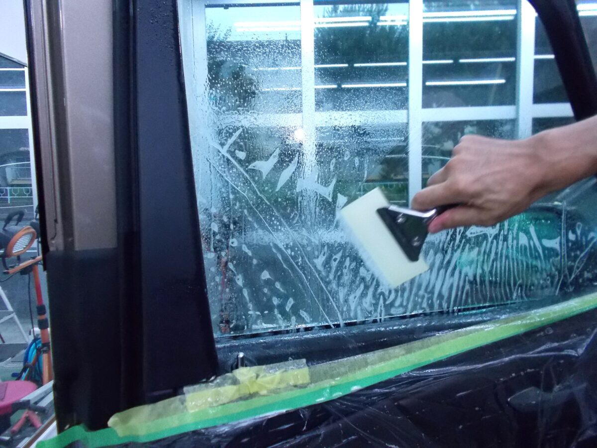 ウインコス透明高断熱フィルムIR-85施工中の写真です。