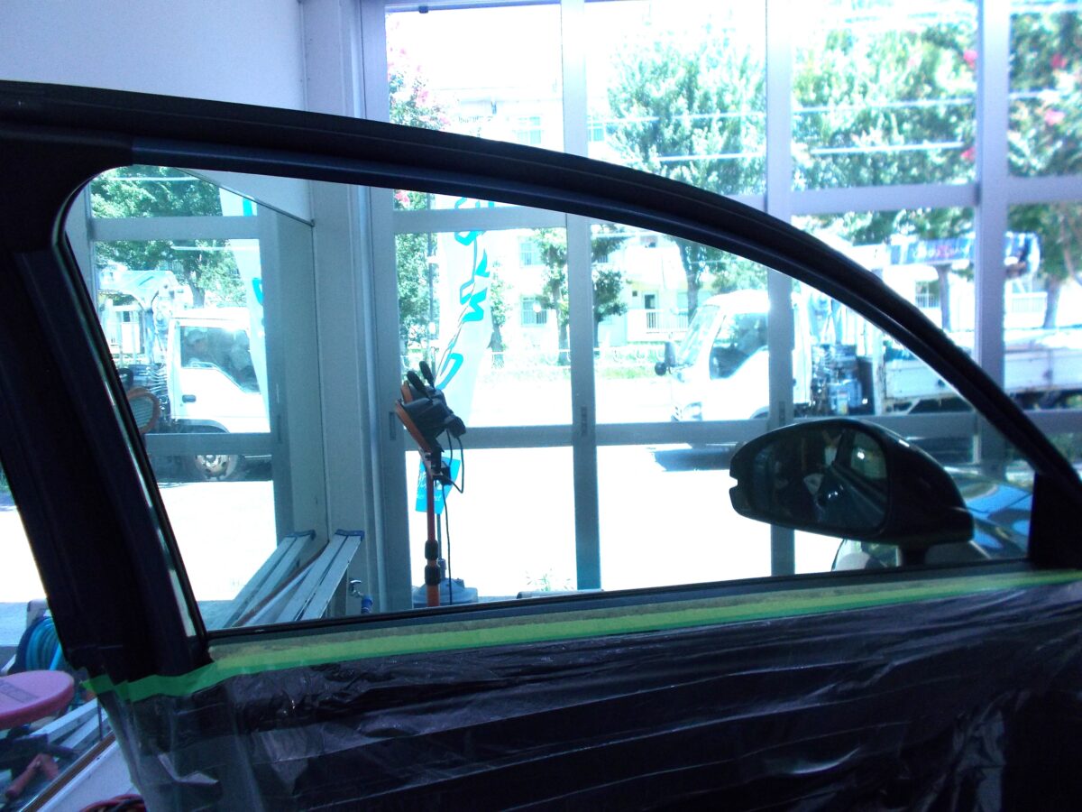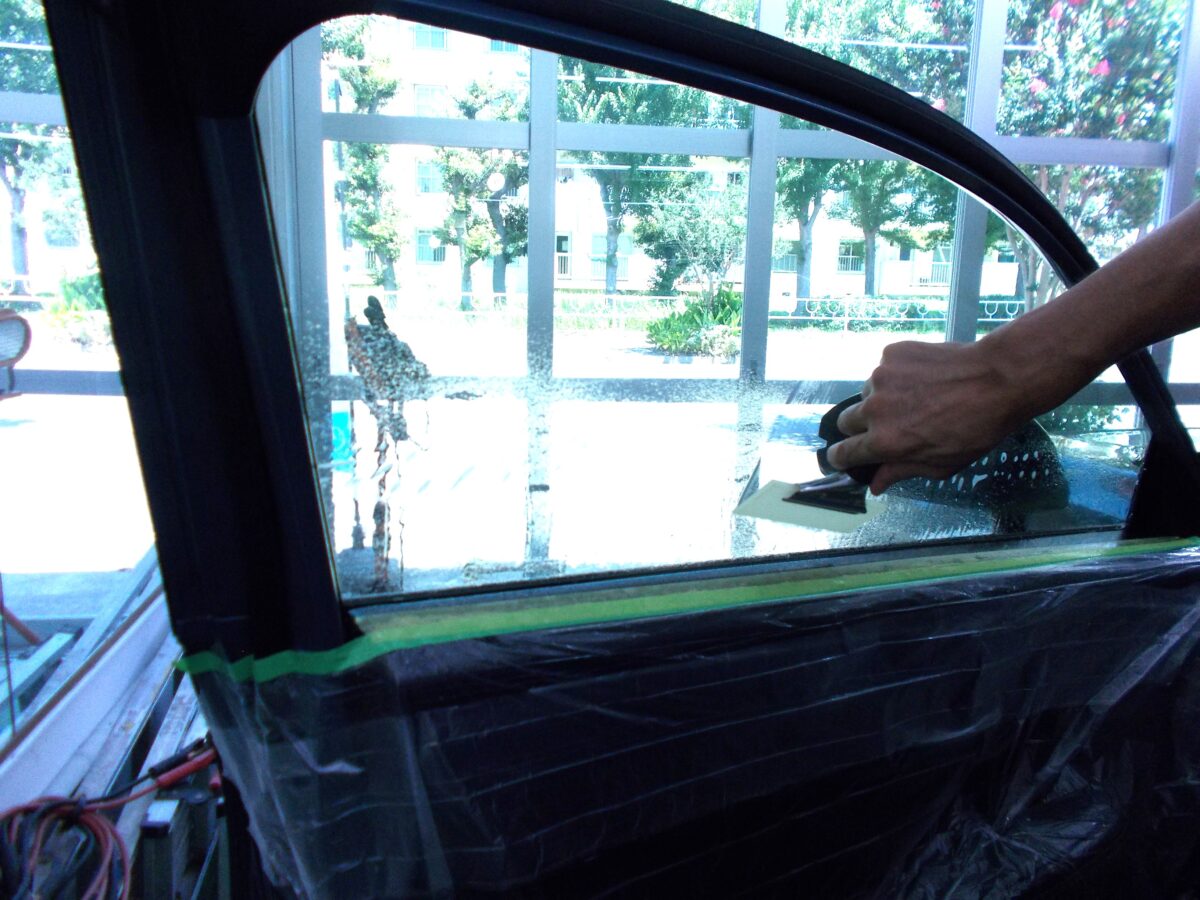 ウインコス透明断熱フィルムIR-90施工中の写真です。