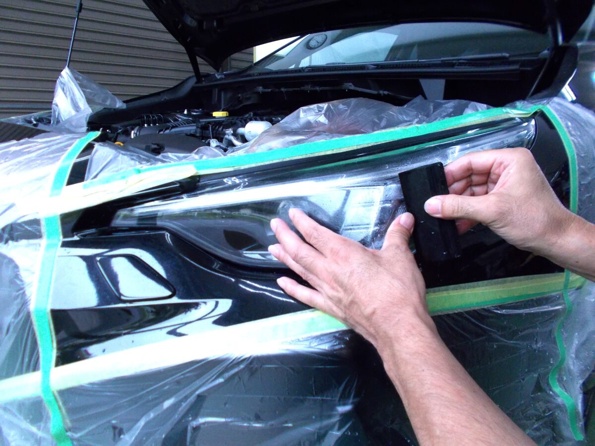 ヘッドライトプロテクションフイルム施工中の写真です。