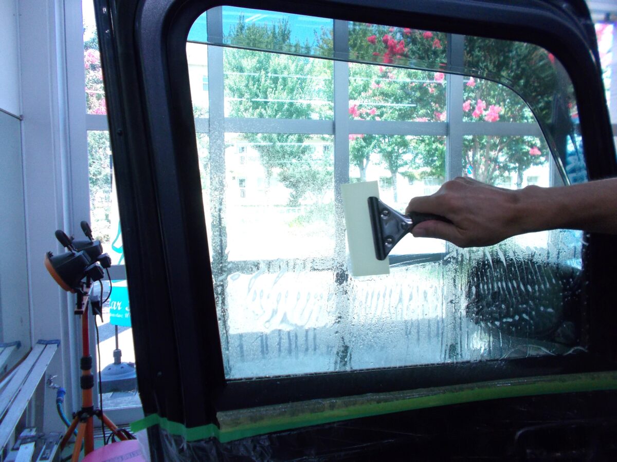 ウインコス透明断熱フィルムIR-90施工中の写真です。