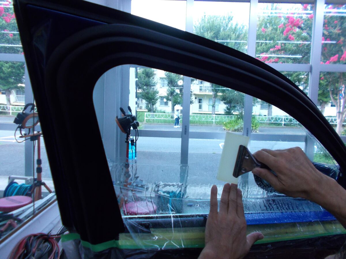 ウインコス透明高断熱フィルムIR-85施工中の写真です。