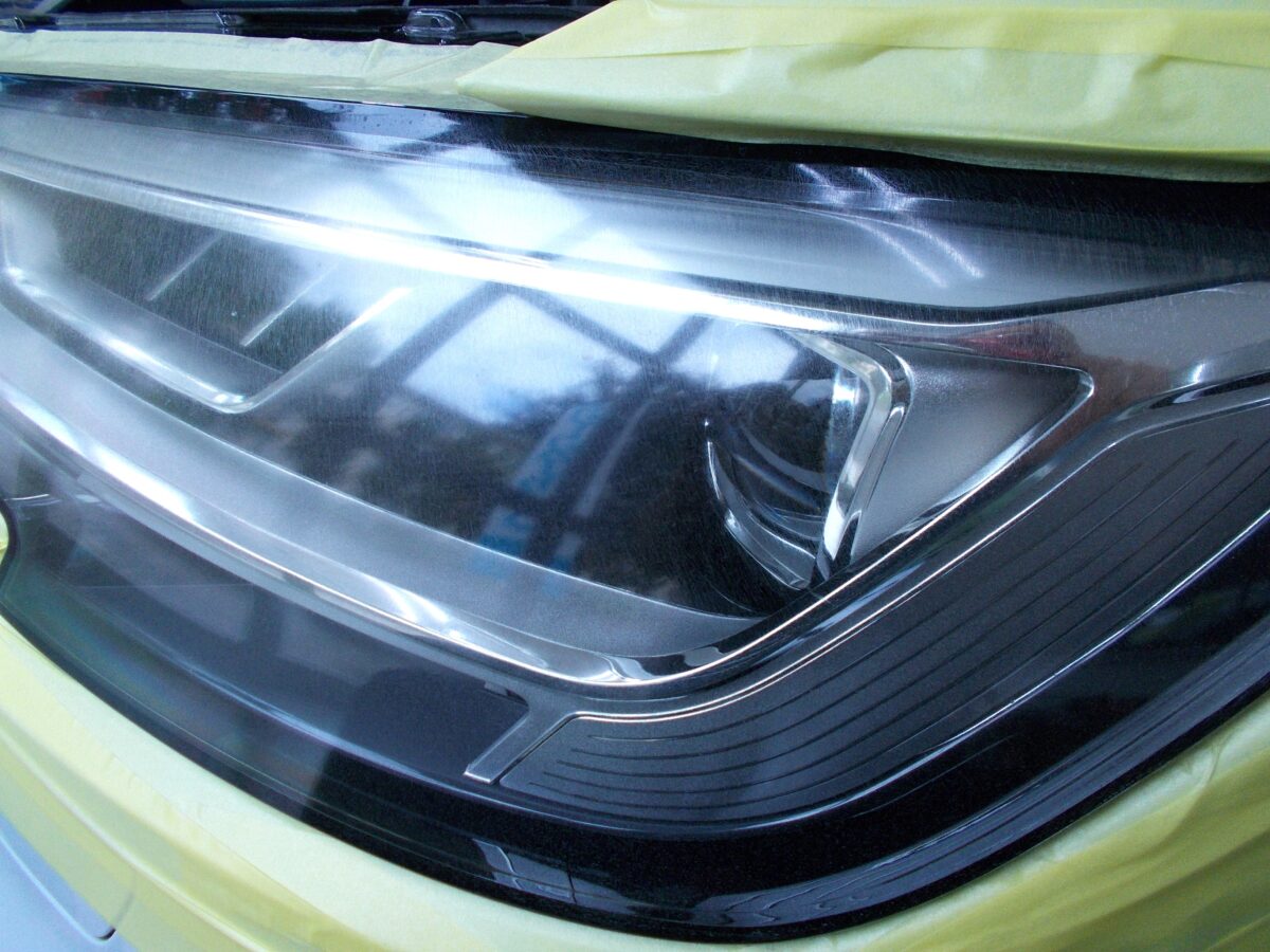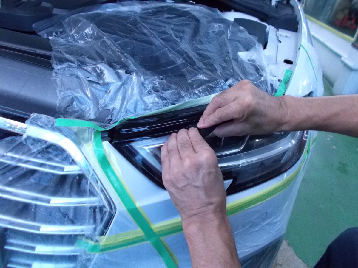 ヘッドライトプロテクションフイルム施工中の写真です。