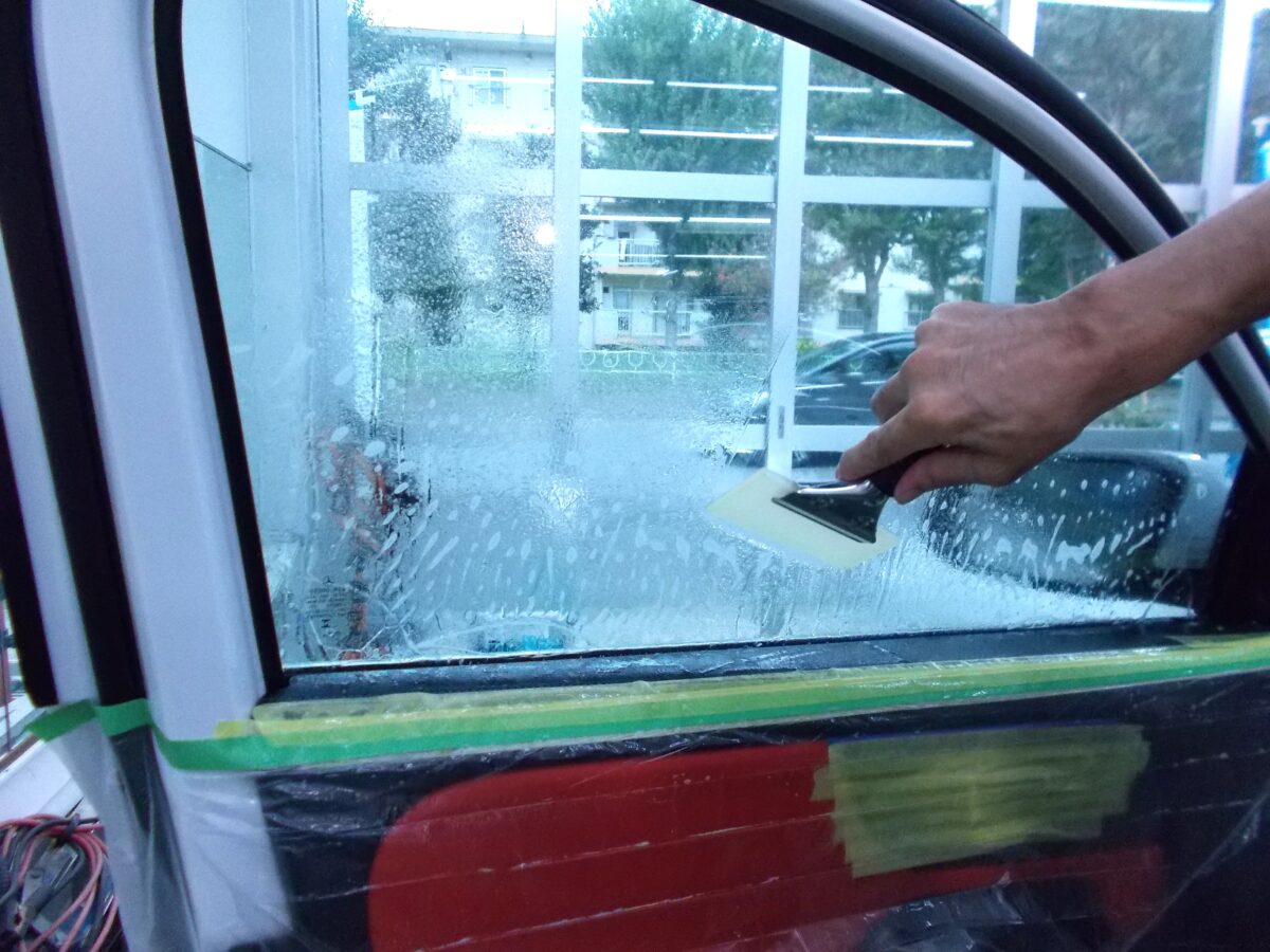 ウインコス透明高断熱フィルムIR-85施工中の写真です。