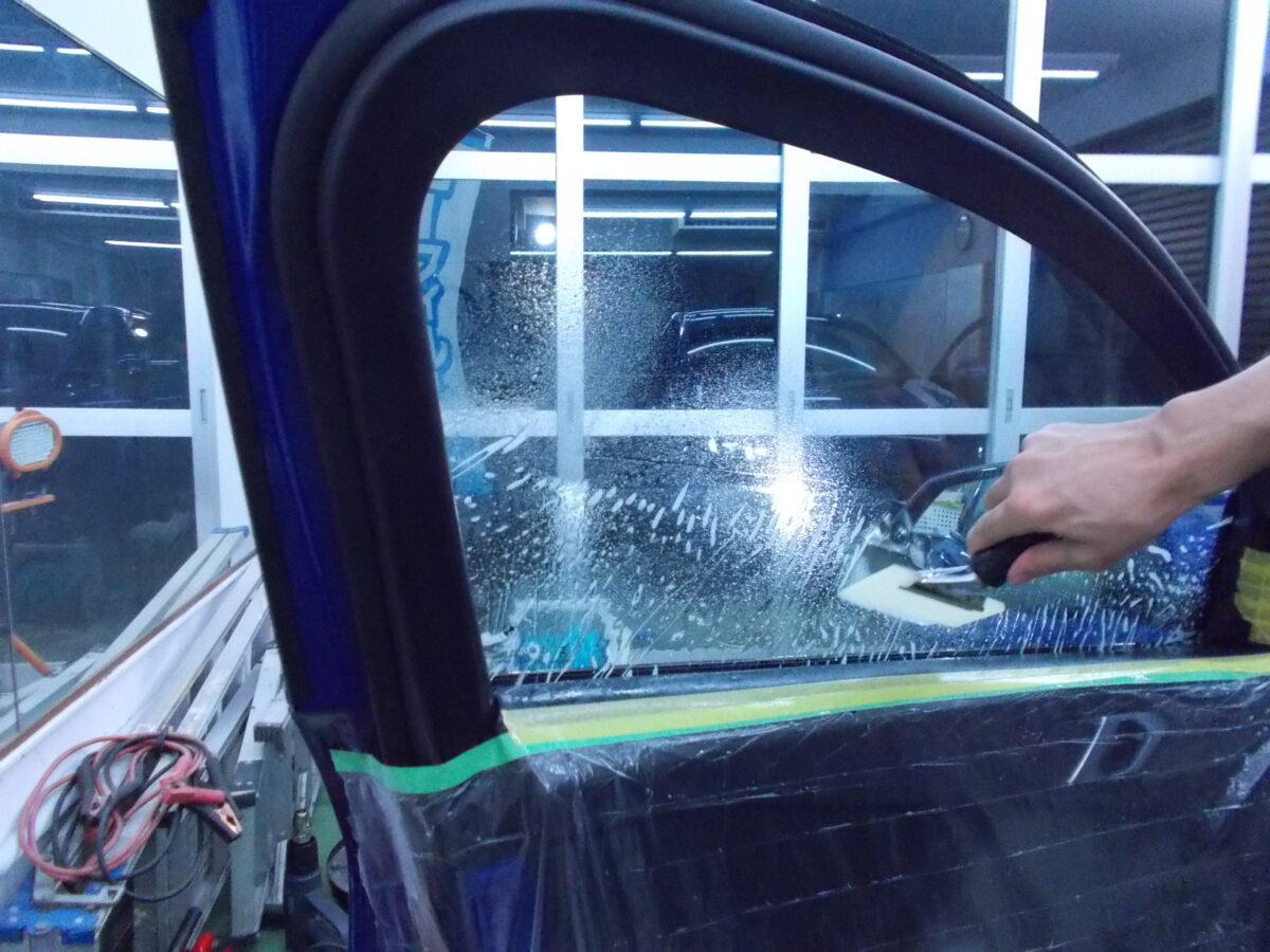 ウインコス透明高断熱フィルムIR-85施工中の写真です。